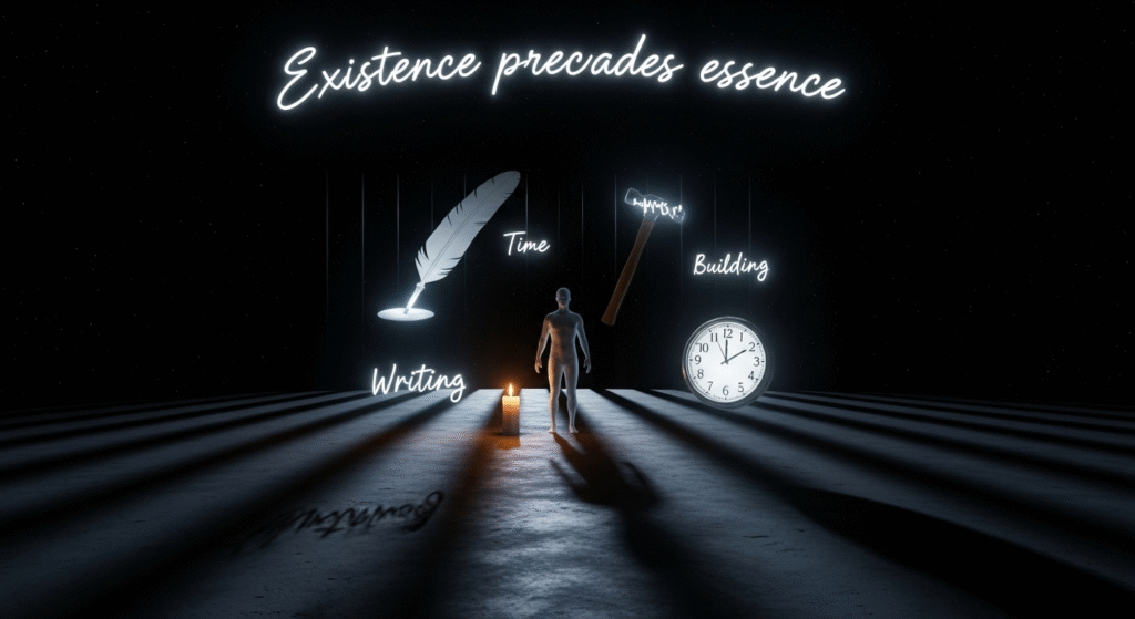 Here, existentialism makes its grand entrance, saying: “Hello, I exist, before my essence.” Existentialism flips this definition on its head. In 1945, the French philosopher Jean-Paul Sartre would say a very important sentence in philosophy in one of his lectures… “Existence precedes essence.” This sentence would represent one of the most important founding pillars of his existential philosophy.